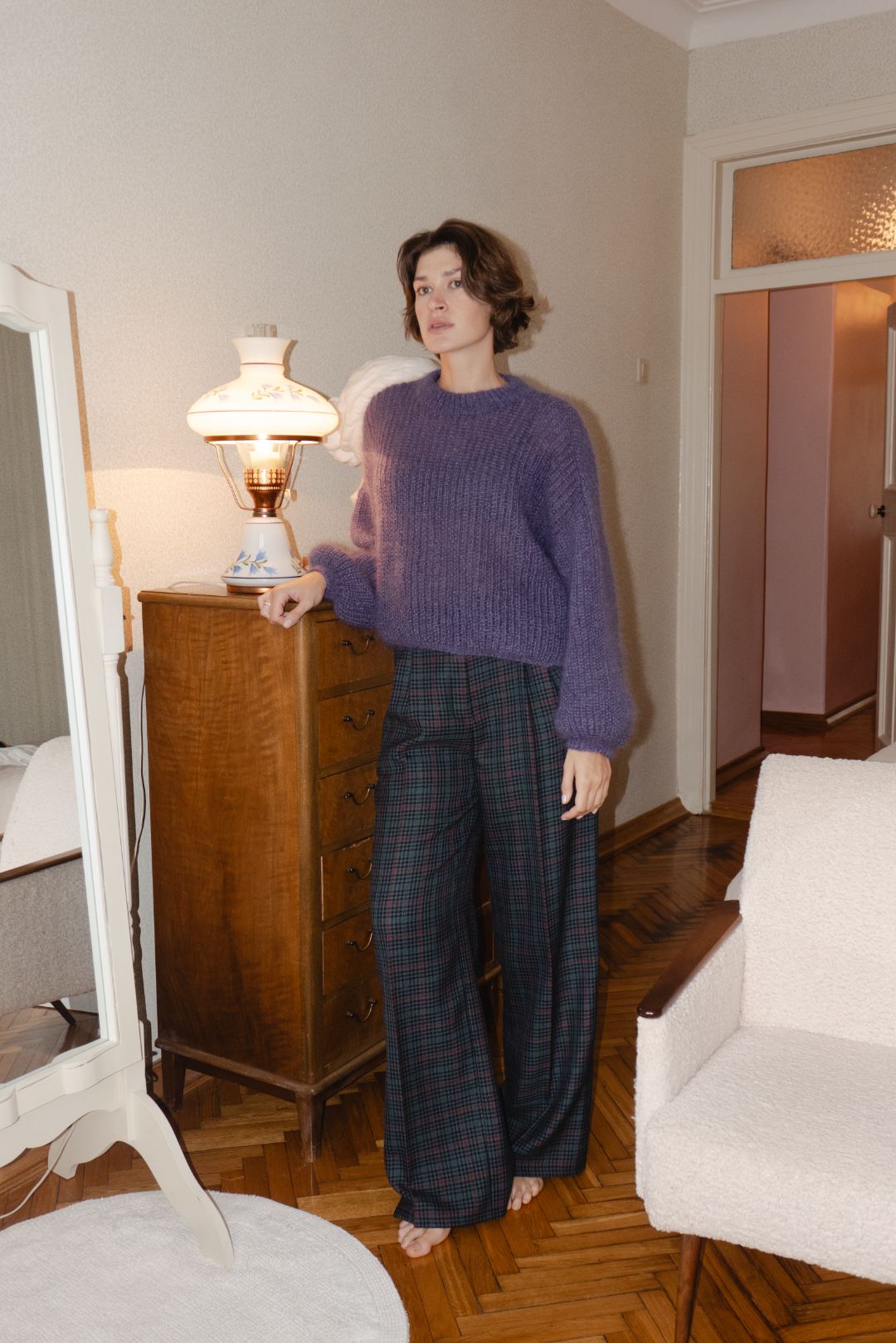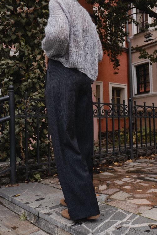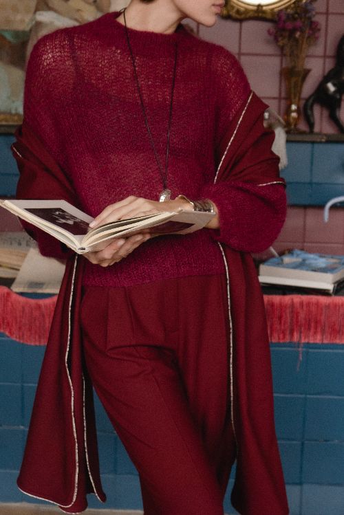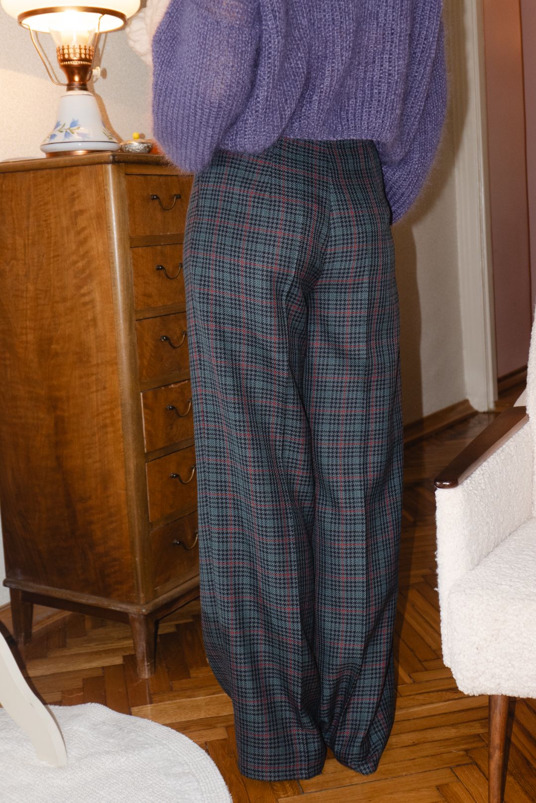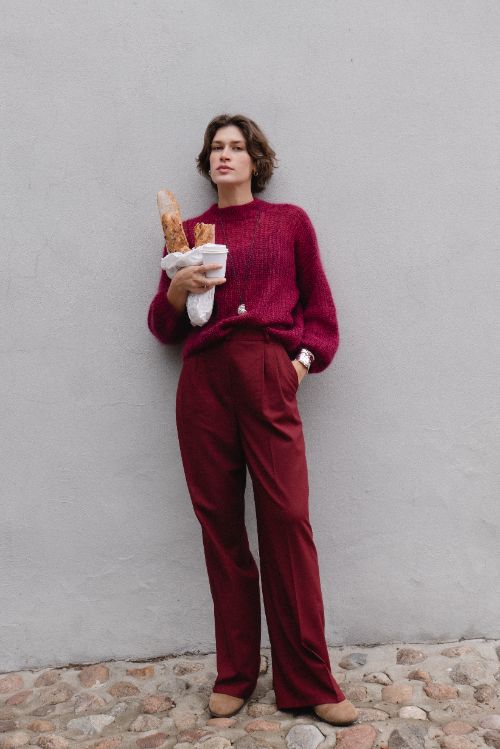 Прямые брюки из тонкой шерсти — в сером, бордо и в клетку — как отражение парижских улиц, мокрых от дождя и наполненных ритмом жизни.