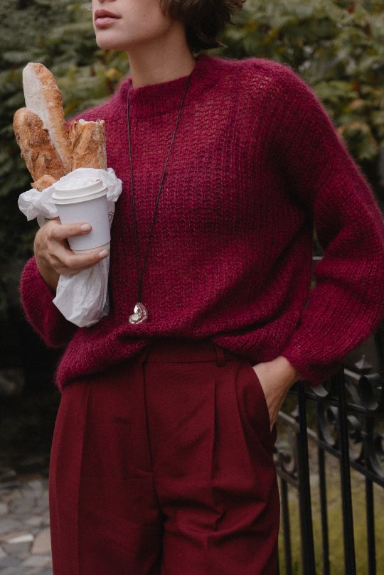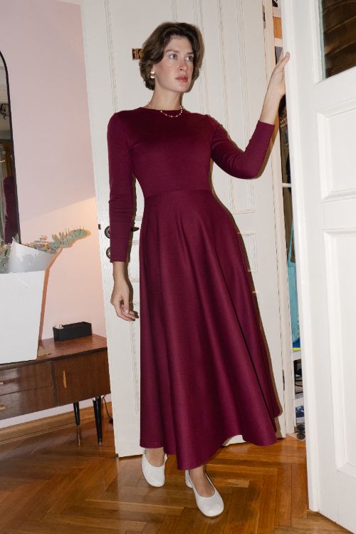 И бордовое платье миди с расклешенной юбкой — как последний яркий лист, закружившийся в вальсе ветра.